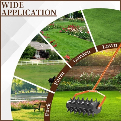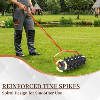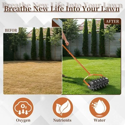 Improve your lawn’s health and appearance with this 18-inch Heavy Duty Lawn Aerator. Designed with a durable galvanized steel drum and upgraded double spikes, it efficiently penetrates the soil to enhance aeration and promote strong root growth. The thickened cylinder can be filled with sand or hold weights to ensure deeper soil penetration, while the rust-resistant coating ensures long-term outdoor use. Ideal for small to medium-sized lawns and gardens, this manual aerator is an eco-friendly alternative to powered equipment—no fuel or electricity required.