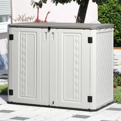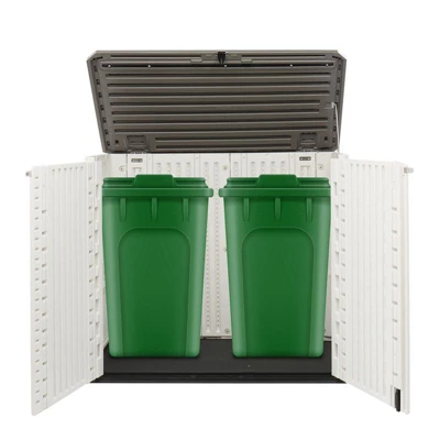 The Patio-Store Horizontal Shed provides accessible storage for your backyard, garden, or poolside. With its 34 cu. ft. storage capacity, this shed boasts a spacious interior that can hold up to two – 32Gal trash cans, or a wide array of patio accessories, pool equipment or garden tools. With its sloped threshold, even your push lawnmower can be easily rolled in or out for convenient weatherproofstorage.