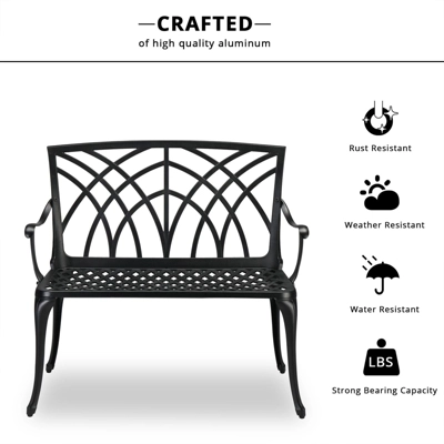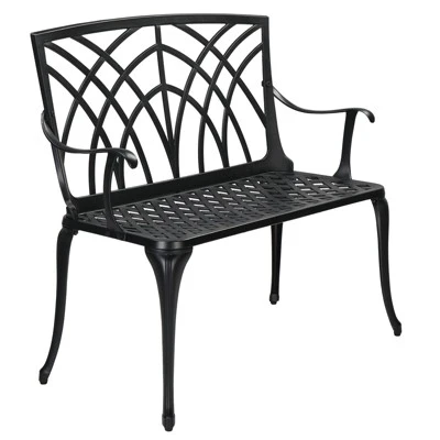 This outdoor bench brings a classic look and extra seating to your patio or garden. Crafted from a lightweight aluminum frame, it’s easy to move and designed to withstand various outdoor climates. The ergonomically designed mesh backrest and curved arms offer both style and comfort. With curved arms and a timeless look, this bench is a versatile addition to your outdoor space. It’s paintable and stainable, allowing you to customize it to match your décor. Enjoy relaxing or dining al fresco with this elegant outdoor bench.