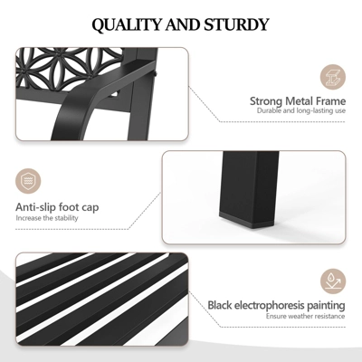 - QUALITY & STURDY: The 50-inch metal outdoor bench is made of high quality metal for durability. It is wind and rain resistant and can withstand all kinds of harsh weather, ideal for outdoor use. The legs are equipped with non-slip feet to make the bench more stable.