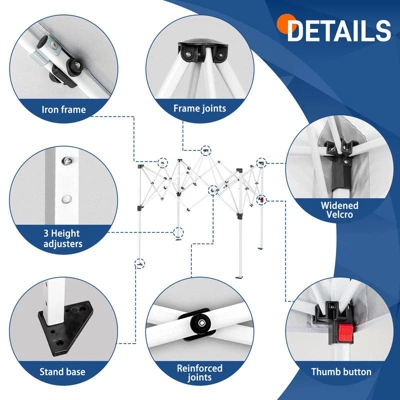 The pop-up canopy is made with white powder coated steel frame & waterproof 210D oxford fabric cover;Blocks 90% of sunlight and provides UV protection,which is suitable for outdoor use in both sunny and rainy days;It is 10 x 10 feet(W x D)in size and can accommodate up to 8 people;It comes with a portable storage bag for easy storage and movement.