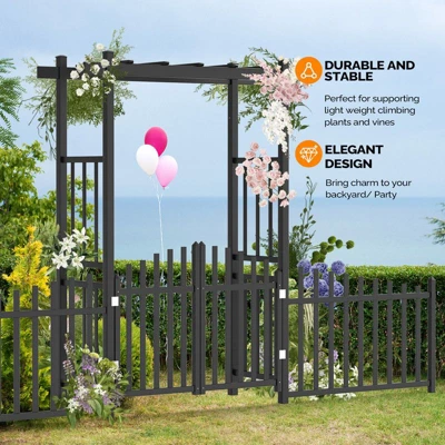 - The garden arch is for climbing vines, while the double gates decorate the entrance.