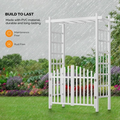 The white PVC arch is perfect for climbing plants and vines to grow which makes a timeless addition to your garden or courtyard. Made of premium weather-resistant vinyl and maintenance free. All of our products are crafted from the highest quality materials using state-of-the-art equipment. We strive to create products that are long lasting, reliable, and presentable. Designed with 2 gates, which is convenient and artistic.