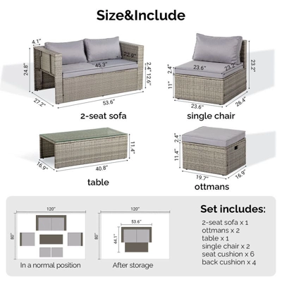 - Space-saving Design: Enjoy a small patio space with this compact patio sectional furniture, featuring two chairs that can be easily stored underneath the loveseat and the two ottomans tuck perfectly under the coffee table. This intelligent configuration allows the entire set to occupy significantly less space during winter storage compared to conventional outdoor furniture sets