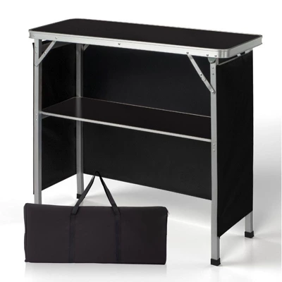 Designed for versatility, portability, and style, this Portable Folding Bar Table with Shelf is your go-to solution for events, trade shows, parties, and more. Built with a durable aluminum alloy frame and reinforced MDF surfaces, this table delivers both strength and stability. Its foldable structure and included carrying bag make transportation a breeze, and the professional black skirt adds a polished look suitable for any setting. Whether used as a presentation podium, service counter, or portable bar, this table is ready for any occasion.