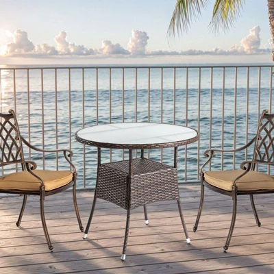 Elevate your outdoor dining experience with this 31.5 in. Wicker Round Dining Table, perfect for small gatherings of 2 to 4 people. Crafted with premium handwoven rattan, this table brings a touch of nature-inspired beauty to your backyard, deck, porch, or poolside area. The superior glass tabletop is both stylish and durable, resistant to stains and scratches, making it ideal for frequent outdoor use. Designed for long-lasting durability, this table is built to withstand the elements while adding a functional yet elegant touch to your outdoor space. Whether you’re enjoying a casual meal or entertaining guests, this table is the perfect centerpiece for any outdoor occasion.
