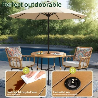 - Round Table with Umbrella Hole: The round dining table features a central umbrella hole for added shade, ideal for sunny days on patios, decks, or poolside.