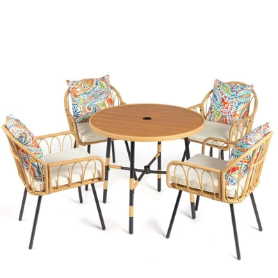 Create a cozy and stylish outdoor dining area with this 5 Pieces Patio Dining Table Chair Set, designed for comfort, durability, and everyday outdoor enjoyment. This set includes four ergonomically designed rattan chairs with thick, breathable cushions and a matching dining table featuring a slatted top and central umbrella hole. The all-weather wicker construction and rust-resistant steel frame ensure long-lasting performance in any climate. Ideal for patios, balconies, gardens, and backyards, the set offers both functionality and natural aesthetic appeal, making it perfect for meals, gatherings, or simply relaxing with loved ones.