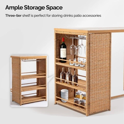 Elevate your outdoor space! Crafted with a wrought iron frame and wrapped in all-weather yellow PE wicker, this bar set blends strength and style. The table features a built-in wine glass holder and a 3-tier storage shelf—keeping essentials within easy reach. Stools include plush 2-inch cushions with breathable fabric—complete with zippers for effortless maintenance and lasting comfort. Perfect for patios, balconies, gardens, or poolside lounging, its compact design saves space while transforming your outdoor experience.